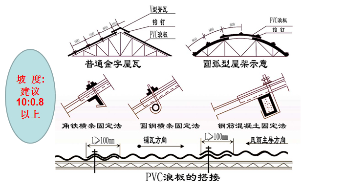 PVC防腐瓦的安装方法 1、1.8mm≥厚度>1.3mm波浪瓦、建议斜屋面檩条跨距≤800mm,而圆拱形屋面檩条跨距≤900mm; 2、3.0mm≥厚度>1.8mm波浪瓦、建议斜屋面檩条跨距≤900mm,而圆拱形屋面檩条跨距≤1000mm; 3、中波、小波、小梯波横向搭接必须搭2个波,纵向搭接长度>300mm; 4、若用自攻螺丝固定,必须预先钻孔,钻孔的直径必须大于固定螺丝直径2-3mm。 注意:檀条的跨度与车间的温度有关,若车间的温度越高,檀条的跨度设计要越小,否则容易引发瓦变形。