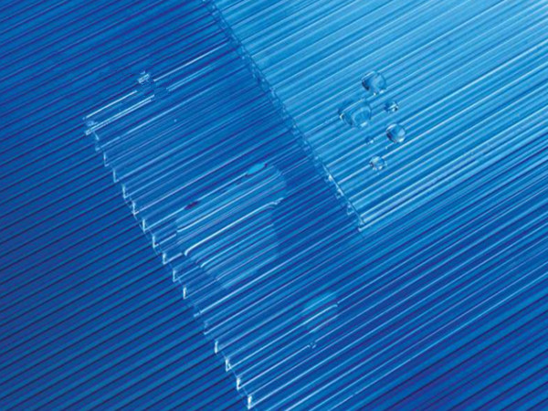 这种创新产品的外表面上有防紫外线涂层,而内表面则采用了专门开发的亲水涂层。这种亲水涂层能增加板材表面张力,减小水与板材的接触角,从而抑制了冷凝水滴形成。结果,在板材内表面只形成一层很薄的水雾,既不会滴落也不会影响材料优良的透光性。